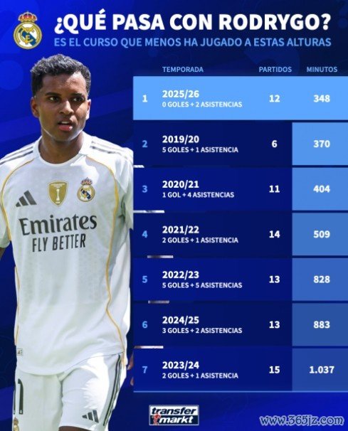 11月8日讯 尽管皇马主帅阿隆索多次在新闻发布会上强调罗德里戈是球队阵中重要一员,但数据却显示了完全不同的情况。在攻击 端,只有恩德里克和贡萨洛-加西亚比他出场时间更少。事实上,这是他加盟皇马以来前15场赛事 出场时间最少的一个赛季。