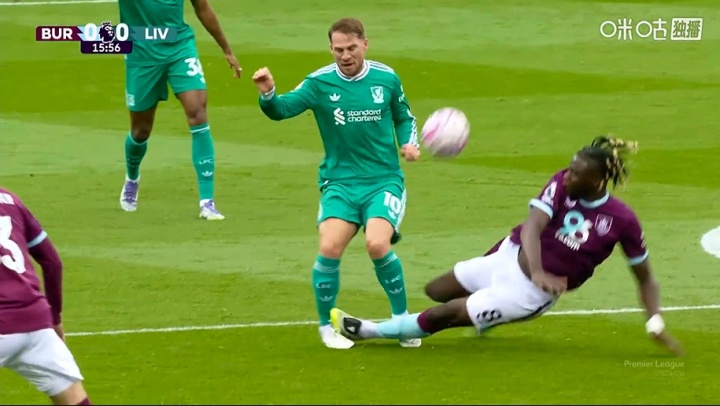 09月14日讯 英超第4轮,利物浦客战伯恩利,赛事 第15分钟,伯恩利球员乌戈丘库亮鞋底铲到麦卡利斯特脚踝,欧洲杯直播吧裁判 出示警告 ,VAR没有介入,随后麦卡起身赛事 继续。
