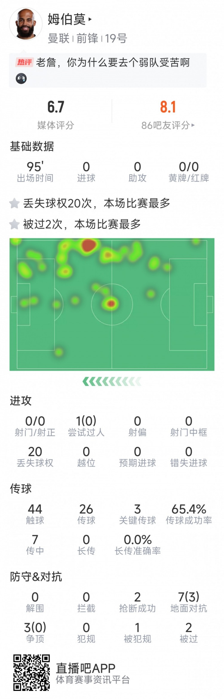 直播吧9月27日讯在本轮英超,布伦特福德3-1击败曼联。本场赛事 姆伯莫杆位迎战旧主,欧洲杯直播吧以下为他在本场数据:
