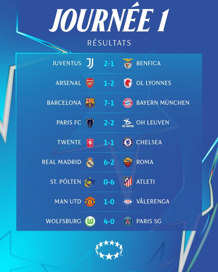 10月9日讯 女足欧冠职业联赛 阶段首轮赛事 战罢,巴萨7-1拜仁,阿森纳1-2里昂,欧洲杯直播吧皇马6-2罗马,尤文、曼联皆取胜。