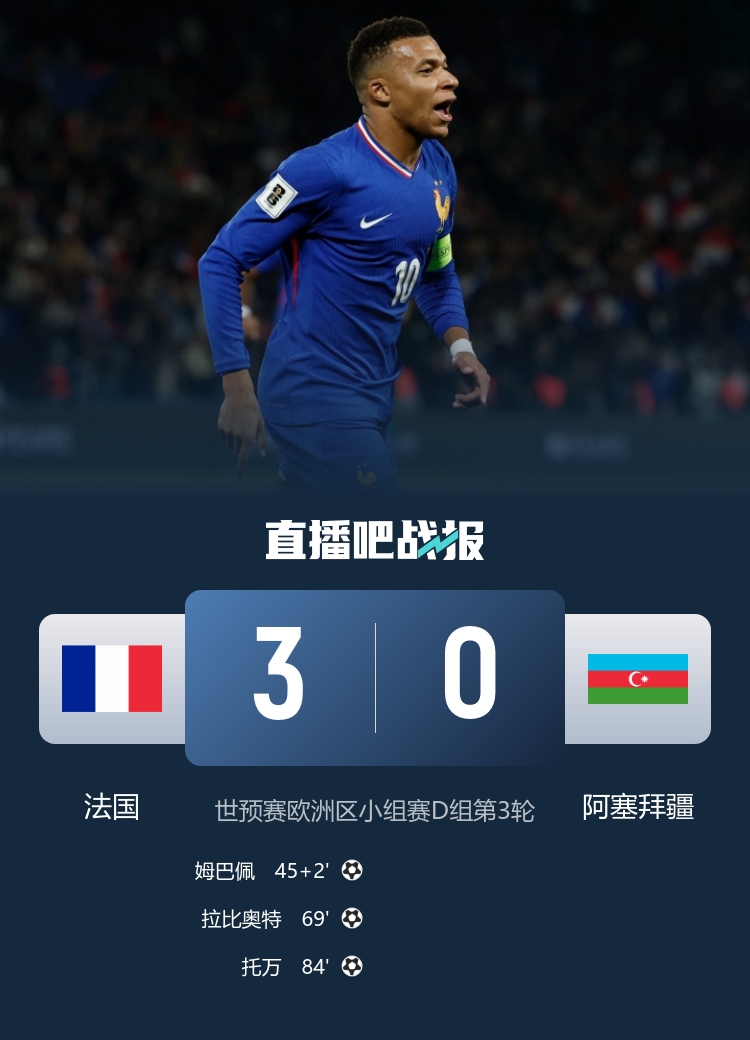 法国队3-0击败阿塞拜疆,自2022年3月25日对阵科特迪瓦以来,免费欧洲杯直播法国队首次在一场赛事 中没有任何一名巴黎圣日耳曼球员出场,结束了连续46场国家队赛事 中都有巴黎球员参赛的记录 。
