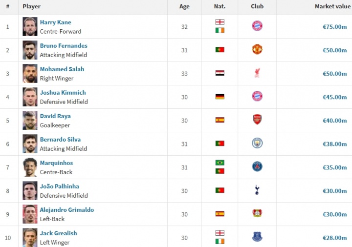 10月15日讯 昨日德转更新德甲球员身价,32岁的凯恩身价没有变化,欧洲杯直播仍为7500万欧。尽管身价没有提升,凯恩在现役30岁以上球员的身价排行中仍断档领跑 。
