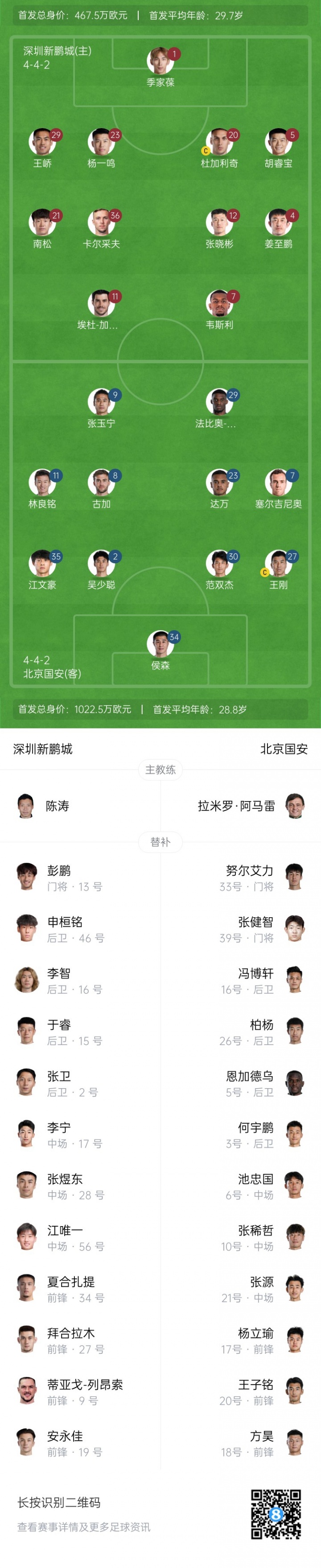 国安后备 :33-努尔艾力-阿巴斯、39-张健智、3-何宇鹏、5-恩加德乌(F)、16-冯博轩、26-柏杨、6-池忠国、10-张稀哲、21-张源、17-杨立瑜、18-方昊、20-王子铭