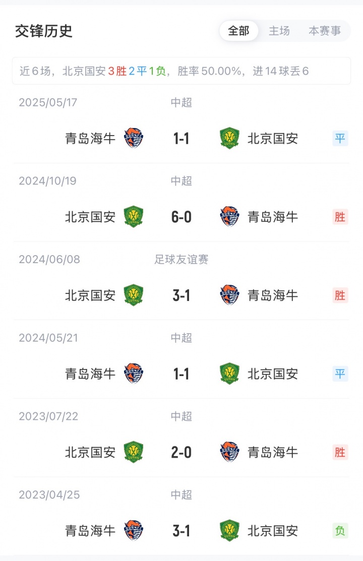积分榜方面,国安目前15胜6平6负,积51分排在积分榜第四位;海牛则是3胜9平15负积18分排在倒数第一,双方本赛季首局 交手,海牛主场作战 1-1战平国安。