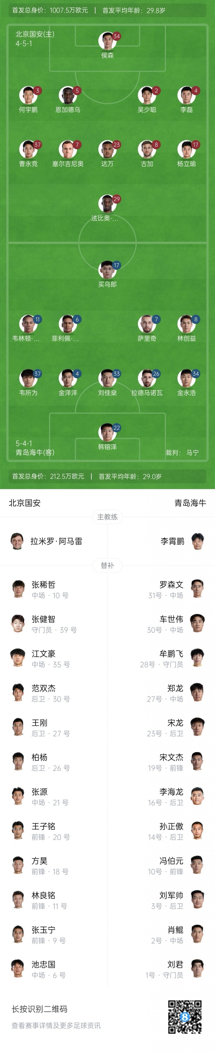 北京国安杆位:34-侯森、2-吴少聪、3-何宇鹏、4-李磊、5-恩加德乌(F)、7-塞尔吉尼奥、8-古加(F)、23-达万(F)、37-曹永竞、17-杨立瑜、29-法比奥(F)