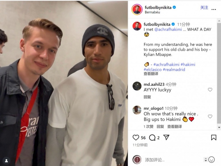 巴黎边卫阿什拉夫来到伯纳乌,观看了这场国家德比,见证老东家取胜,欧洲杯直播球迷社媒晒出与阿什拉夫的合照。