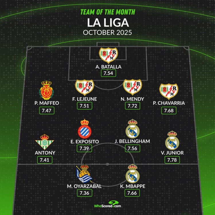 11月3日讯 WhoScored评出了西甲10月最佳阵形 ,免费欧洲杯直播姆巴佩、贝林厄姆、维尼修斯、安东尼在列。