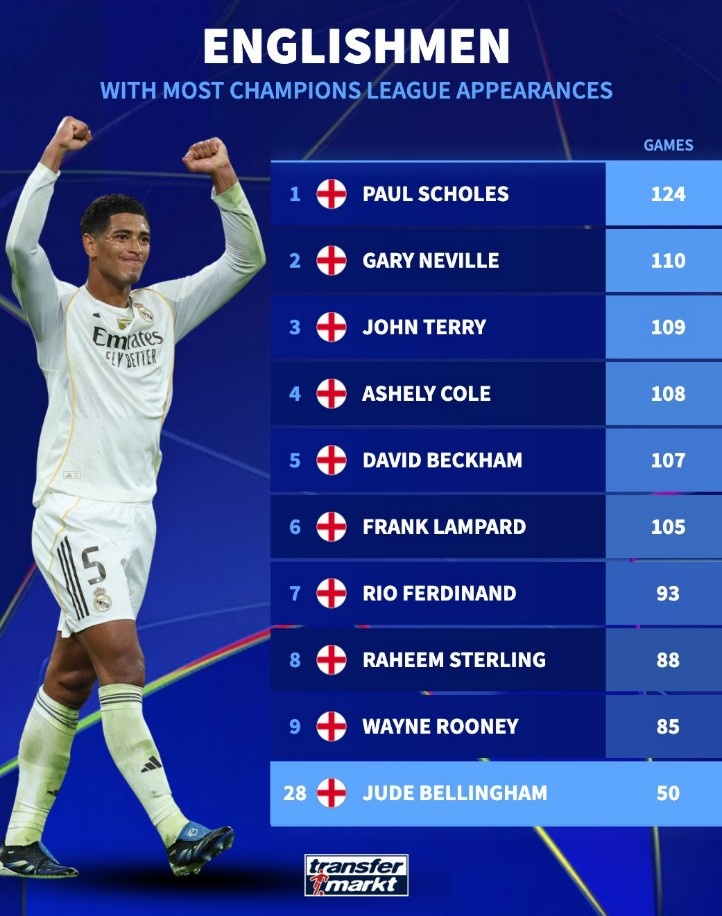 11月5日讯 在本轮欧冠,利物浦1-0击败皇马。贝林厄姆完成生涯50场欧冠里程碑,欧洲杯直播德转也盘点了英格兰球员欧冠出场次数榜,具体如下: