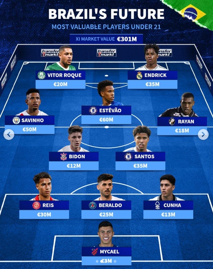 中场球员:布雷诺-比顿(科林蒂安,1200万欧)、安德烈-桑托斯(切尔西,3500万欧)、萨维尼奥(曼城,5000万欧)、埃斯特旺(切尔西,6000万欧)、拉扬(达伽马,1800万欧)