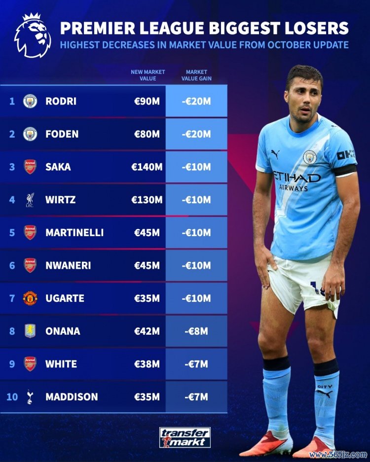 10月17日讯 德转统计了最新的英超球员身价跌幅榜单,曼城中场球员罗德里和福登身价均下降2000万欧元,分列前二,阿森纳四人上榜。