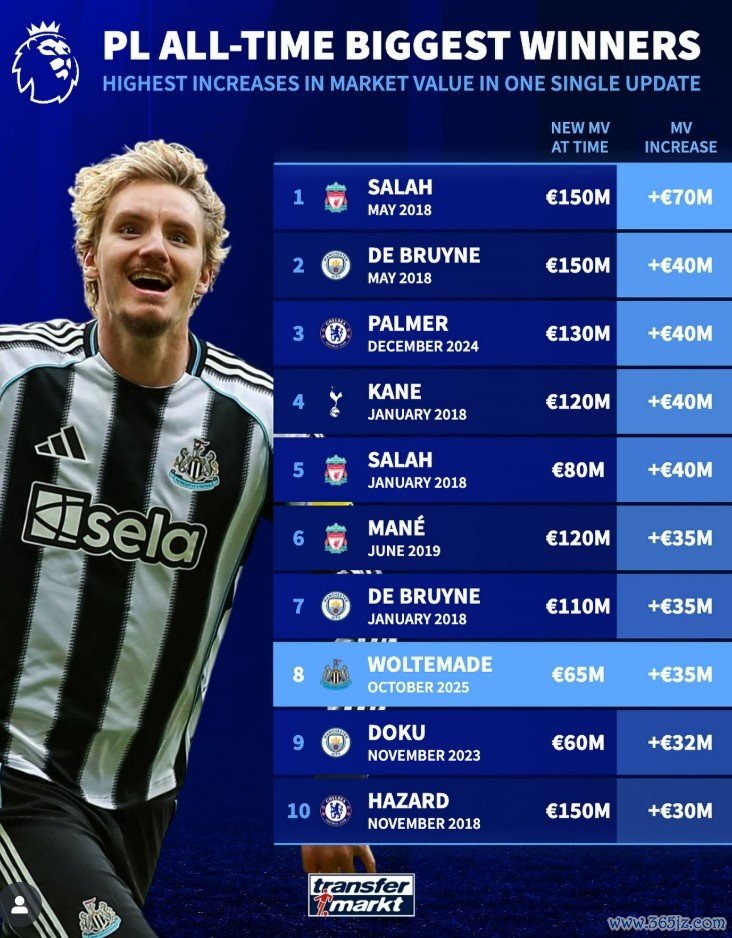 10月20日讯 德转此前更新了足坛球员身价,并盘点了英超球员在单次更新中身价涨幅最高的榜单,具体如下: